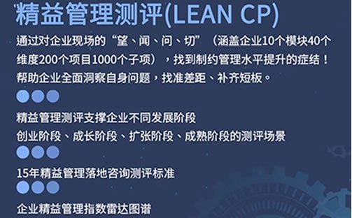 精益管理測評系統(tǒng)是基于整個精益制造模型而發(fā)展的診斷模型,覆蓋客戶全價值流從供應(yīng)商端到客戶端的精益實施狀況,通過測評系統(tǒng)使用者能清晰的了解到目前在組織內(nèi)流程的精益狀態(tài),也能了解從現(xiàn)有的狀態(tài)達到目標狀態(tài)的大概步驟和適用工具,從而為制造業(yè)最重要的價值增值過程改善提供決策依據(jù);針對十大科目實施線上診斷與線下服務(wù),通過對企業(yè)現(xiàn)場的“望、聞、問、切”(涵蓋企業(yè)10個模塊,40個維度,200個項目及1000個子項),找到制約管理水平提升的癥結(jié)!