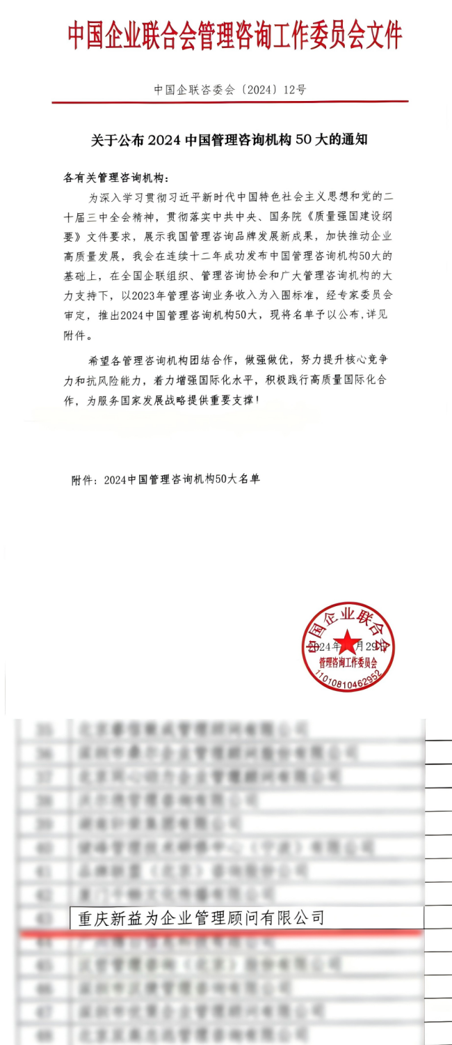 在當(dāng)今時(shí)代浪潮洶涌澎湃之際,2024管理咨詢與培訓(xùn)大會(huì)第八屆中小企業(yè)服務(wù)商大會(huì)盛大召開(kāi)。在這一盛會(huì)上,備受矚目的“2024中國(guó)管理咨詢機(jī)構(gòu)50大”評(píng)選結(jié)果重磅揭曉,重慶新益為企業(yè)管理顧問(wèn)有限公司脫穎而出,成功躋身其中,成為西南地區(qū)企業(yè)管理咨詢領(lǐng)域的璀璨之星,閃耀于全國(guó)的舞臺(tái)之上。