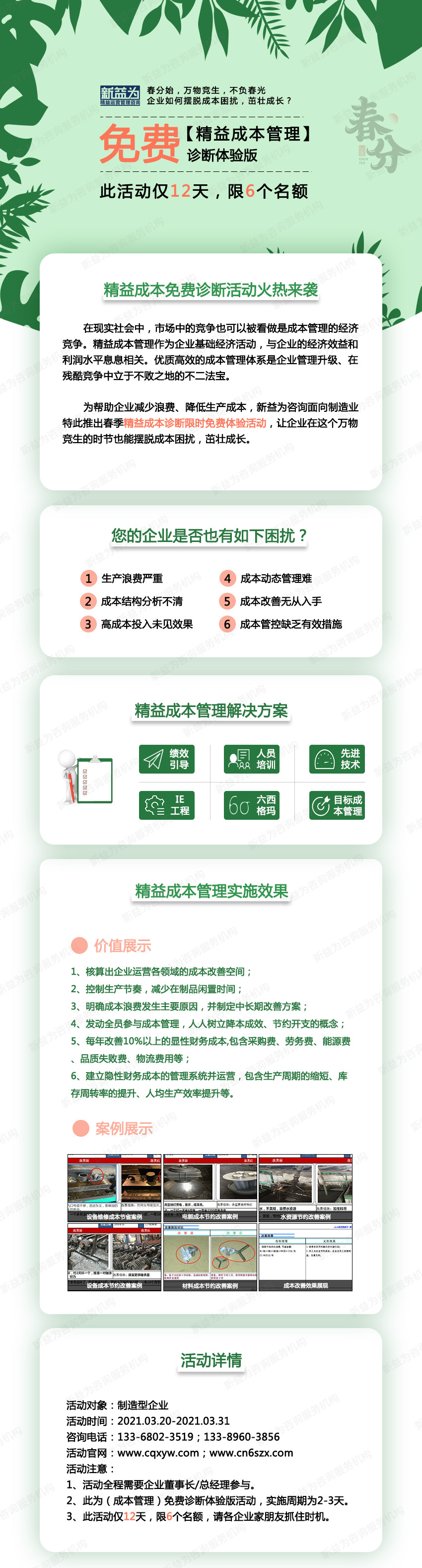 在現(xiàn)實社會中,市場中的競爭也可以被看做是成本管理的經(jīng)濟競爭。精益成本管理作為企業(yè)基礎經(jīng)濟活動,與企業(yè)的經(jīng)濟效益和利潤水平息息相關。優(yōu)質高效的成本管理體系是企業(yè)管理升級、在殘酷競爭中立于不敗之地的不二法寶。 為幫助企業(yè)減少浪費、降低生產成本,新益為咨詢面向制造業(yè)特此推出春季精益成本診斷限時免費體驗活動,讓企業(yè)在這個萬物競生的時節(jié)也能擺脫成本困擾,茁壯成長。